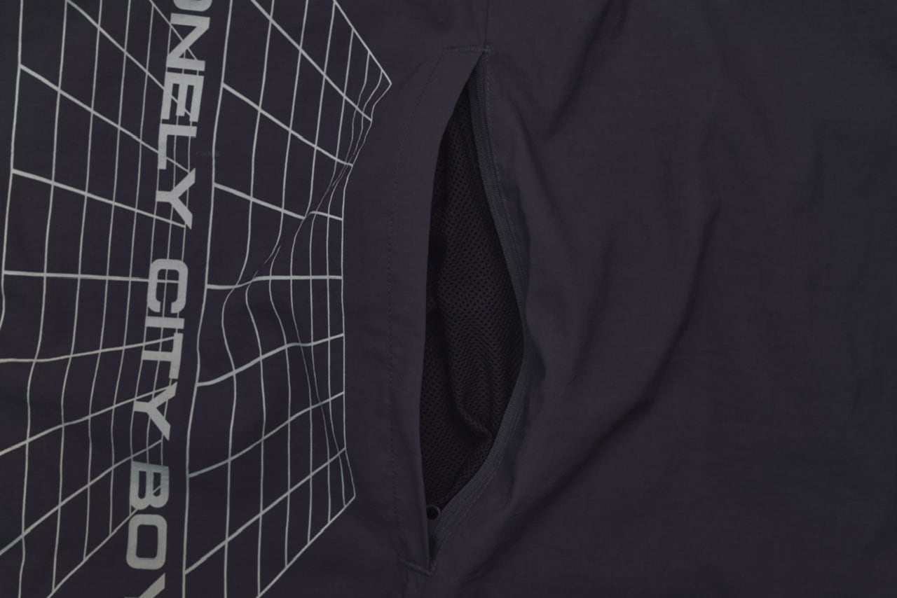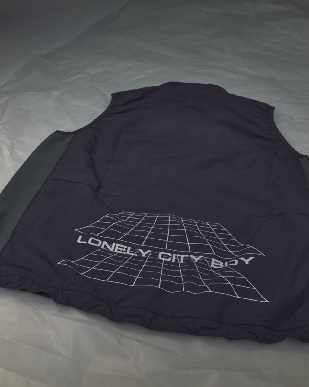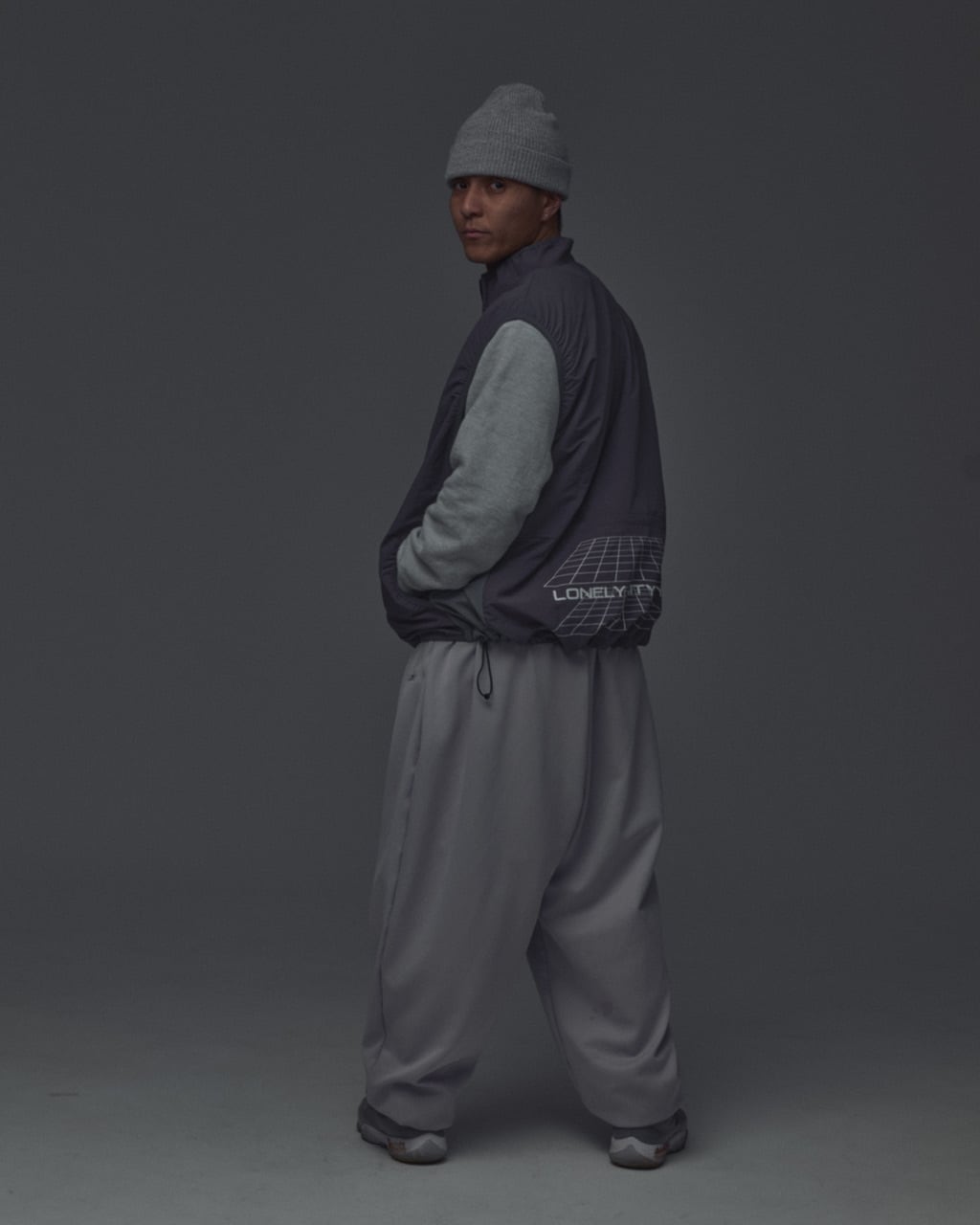 背面に施された《LONELY CITY BOY》のグリッドプリントは、都市生活者の孤独と寂しさを象徴するグラフィック。
