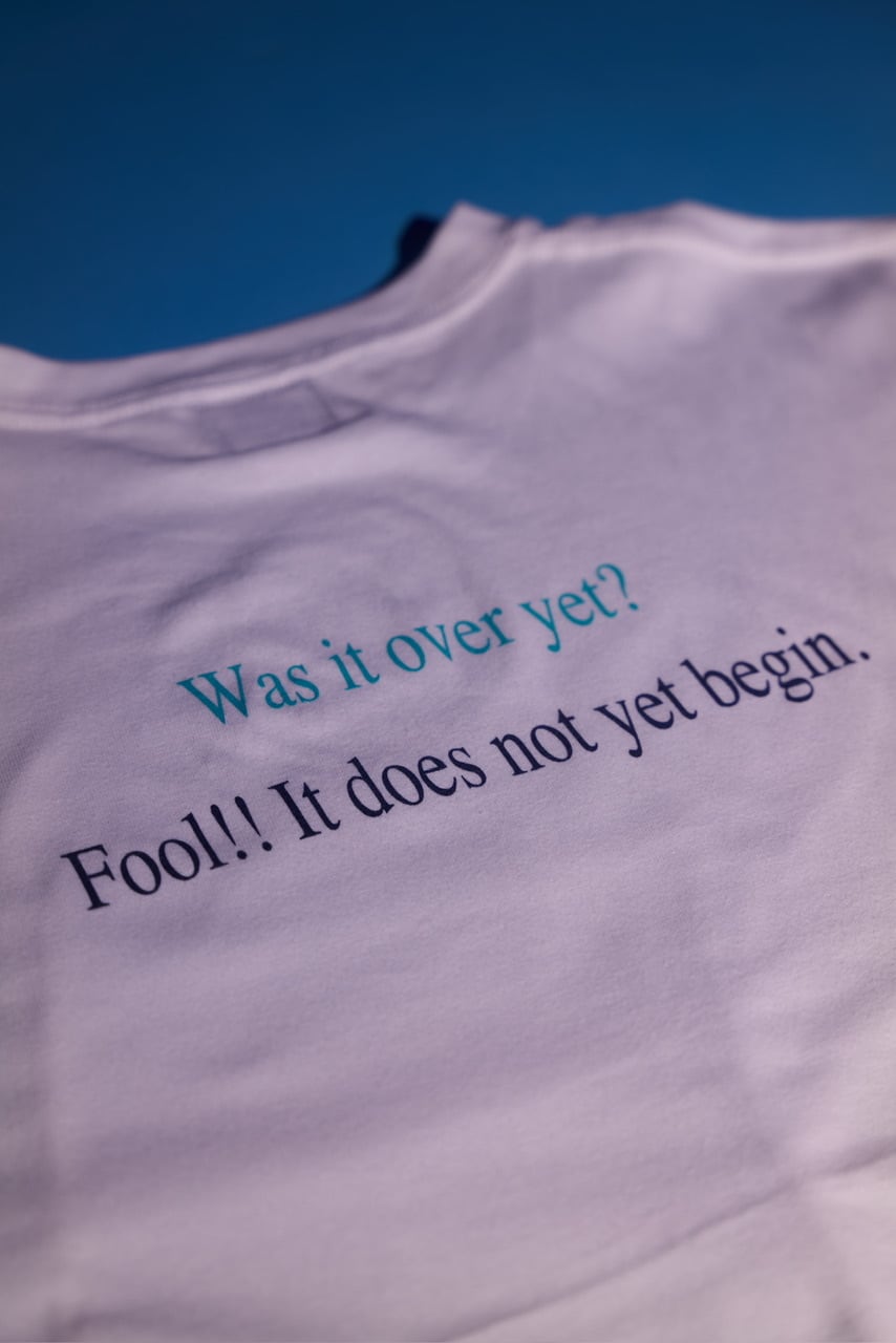 “Was it over yet? Fool!! It does not yet begin.” のメッセージをバックにプリント。