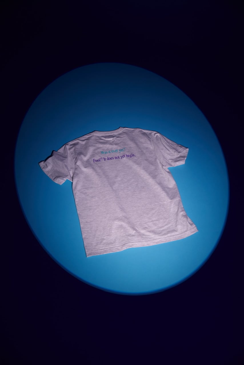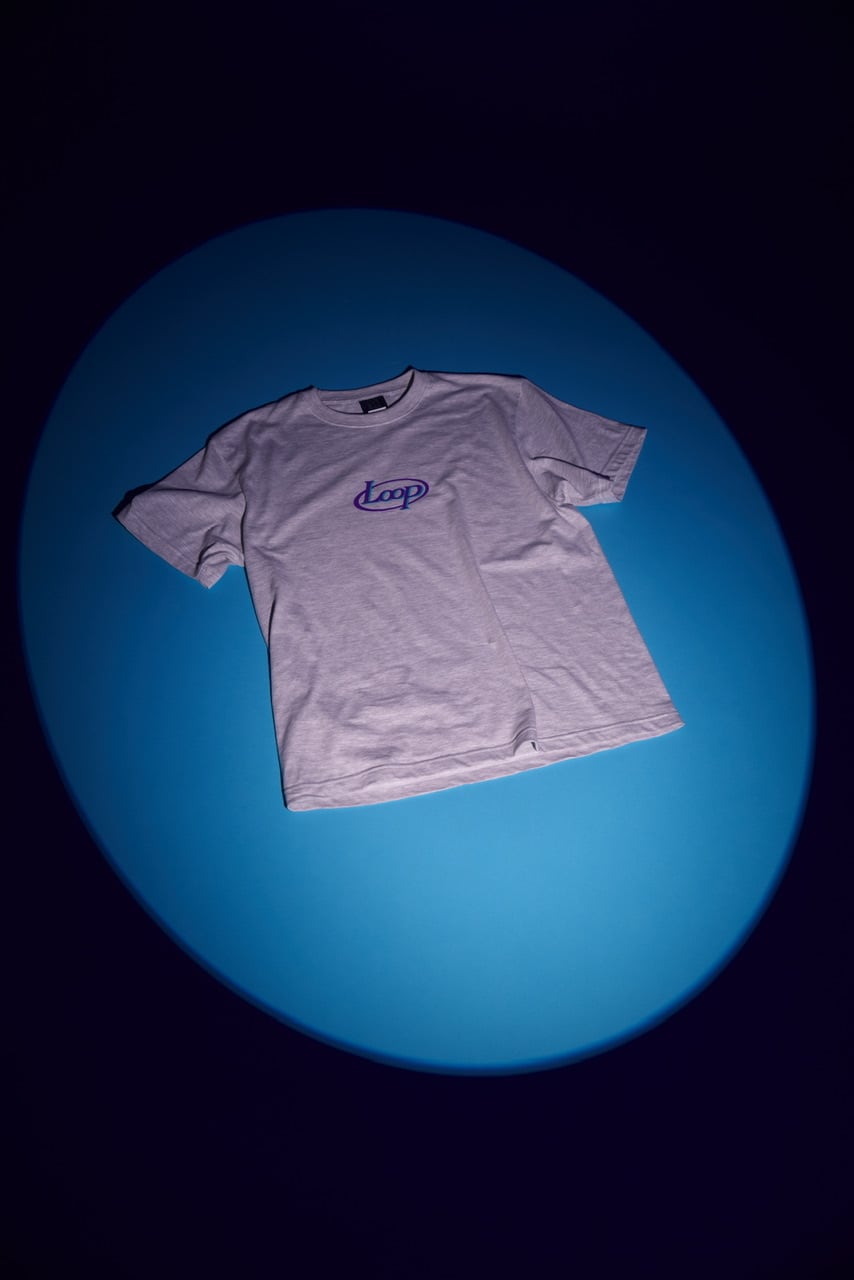やわらかなアッシュグレーに、パープルとターコイズのロゴが浮かぶ一枚。