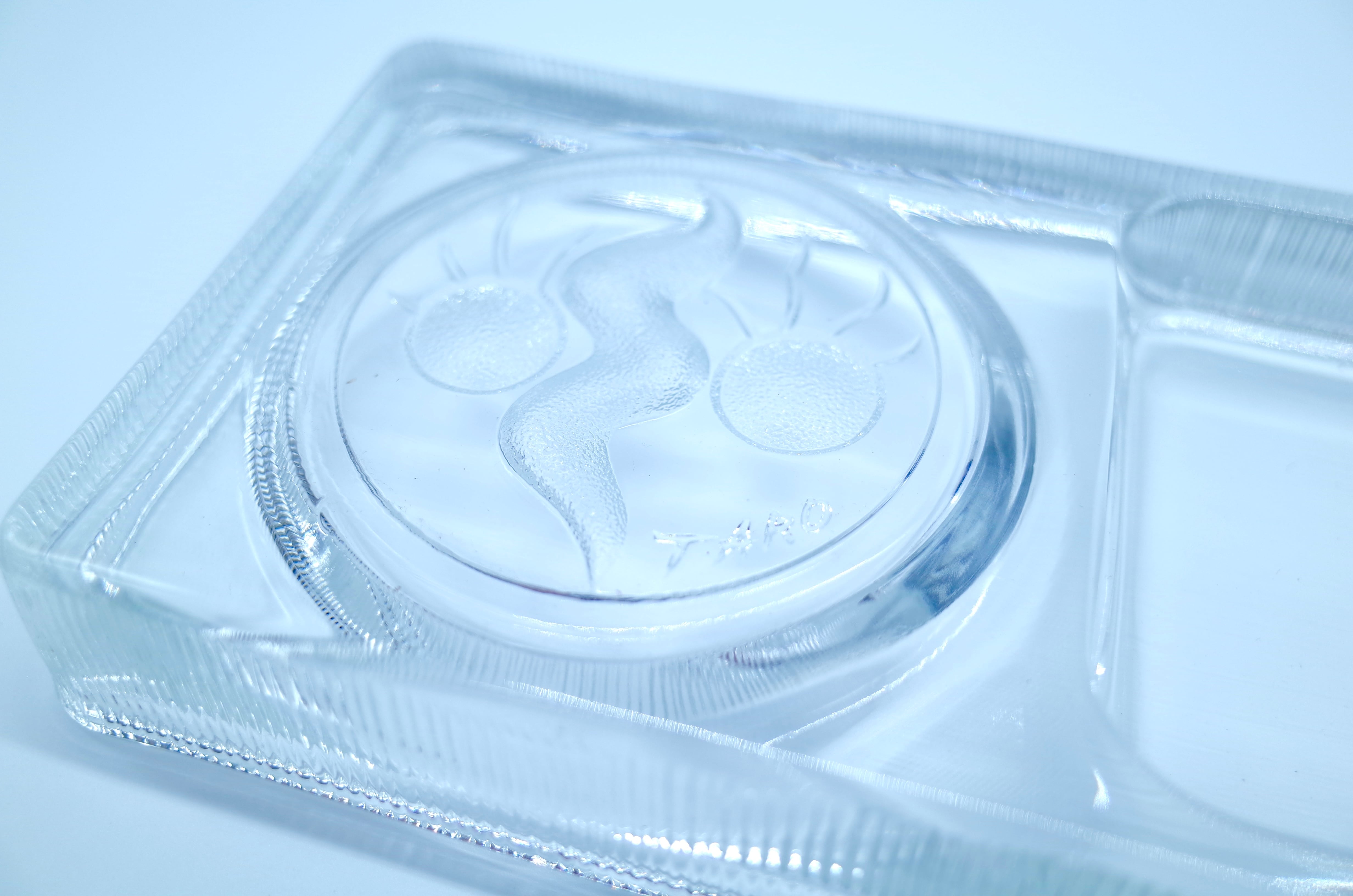 岡本太郎が手がけた“顔”モチーフをあしらったガラスプレート。