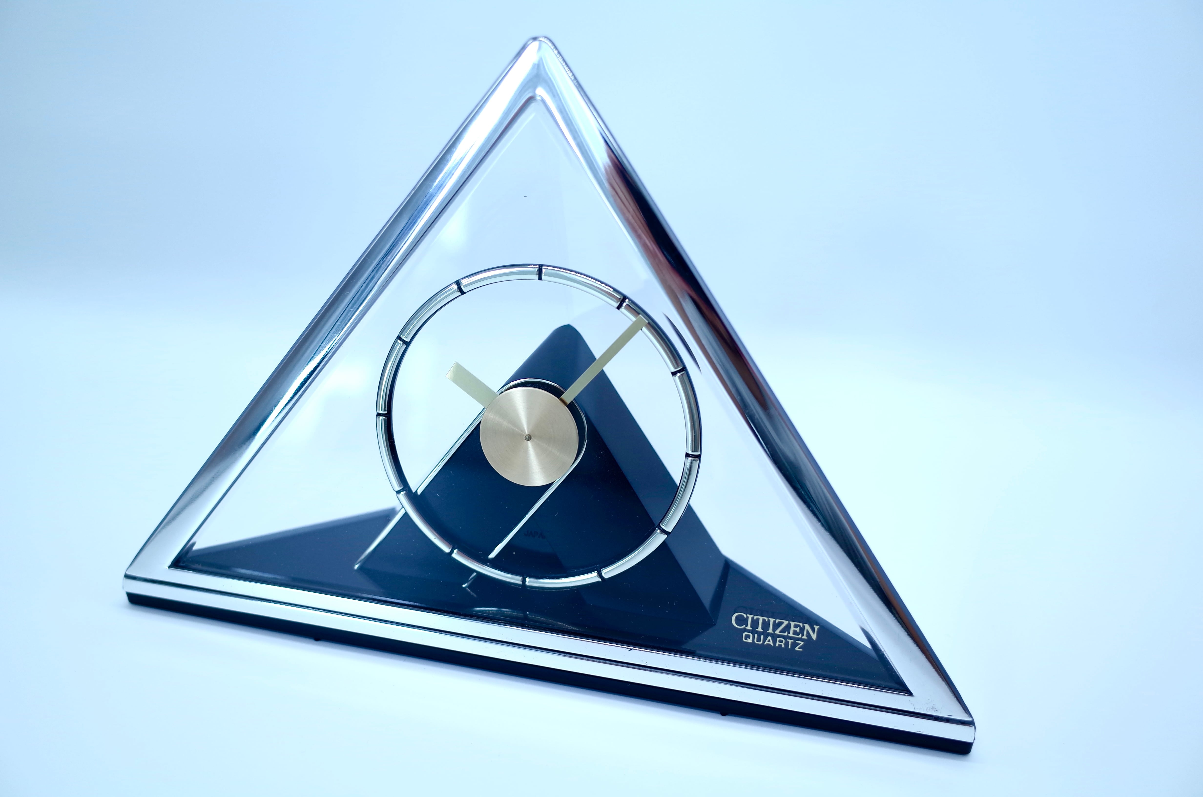 ピラミッド型のフォルムにクロームの縁取り、透明な樹脂ボディという構成が、当時のポストモダン的デザイン感覚をよく表しています。