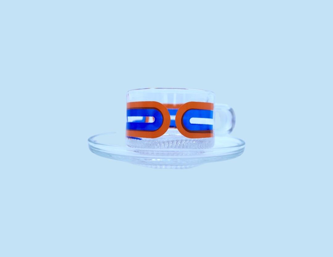 オレンジとブルーのラインが鮮やかに走るガラス製カップ&ソーサー。