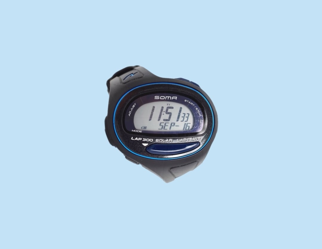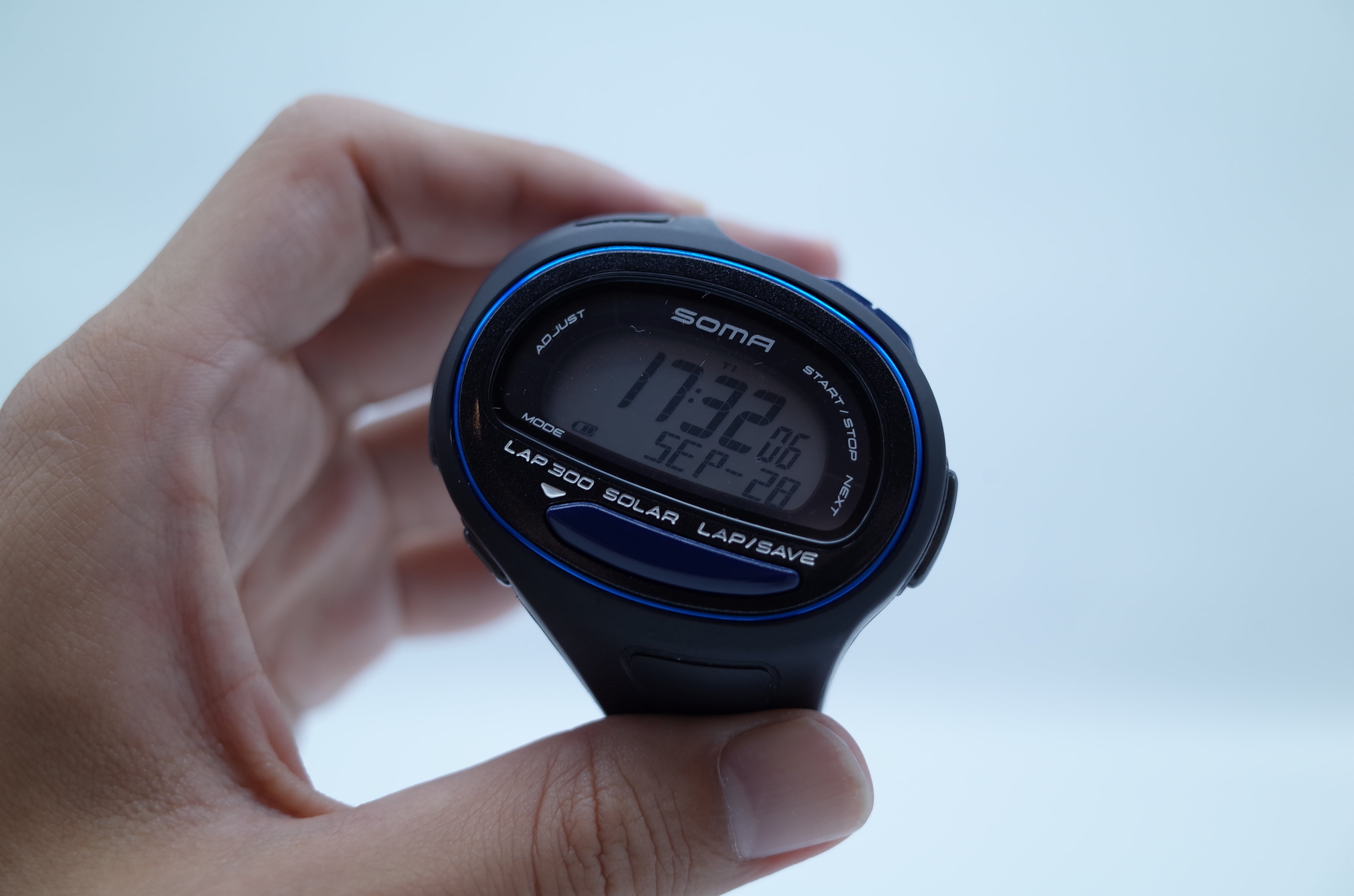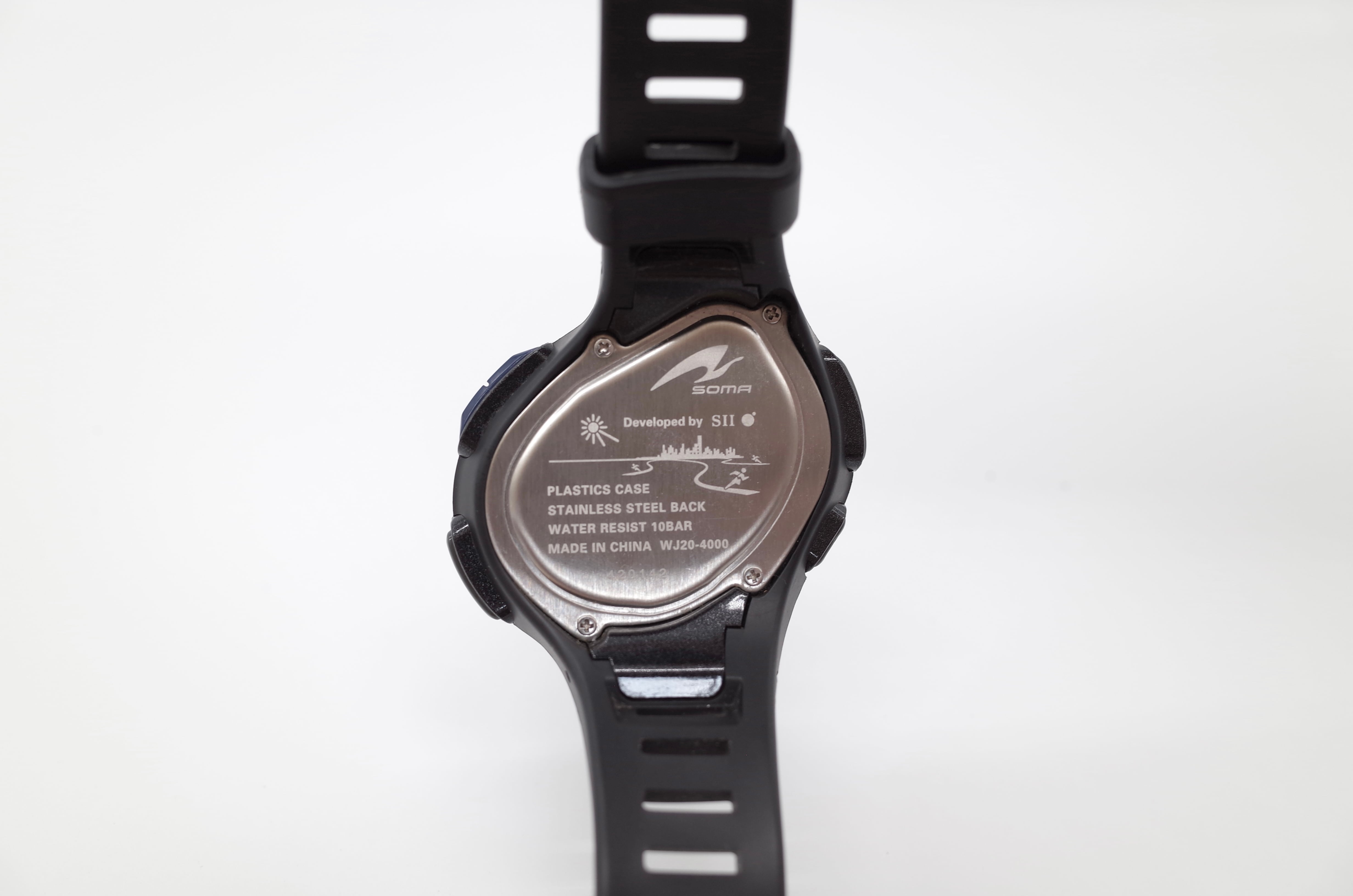 SOMAは当時、ランナーやトレーニング愛好家に向けて開発されたラインで、軽量性とフィット感を重視。楕円形のラウンドケースは腕の動きを妨げないよう設計されており、ランニングギアとしての合理性が反映されています。