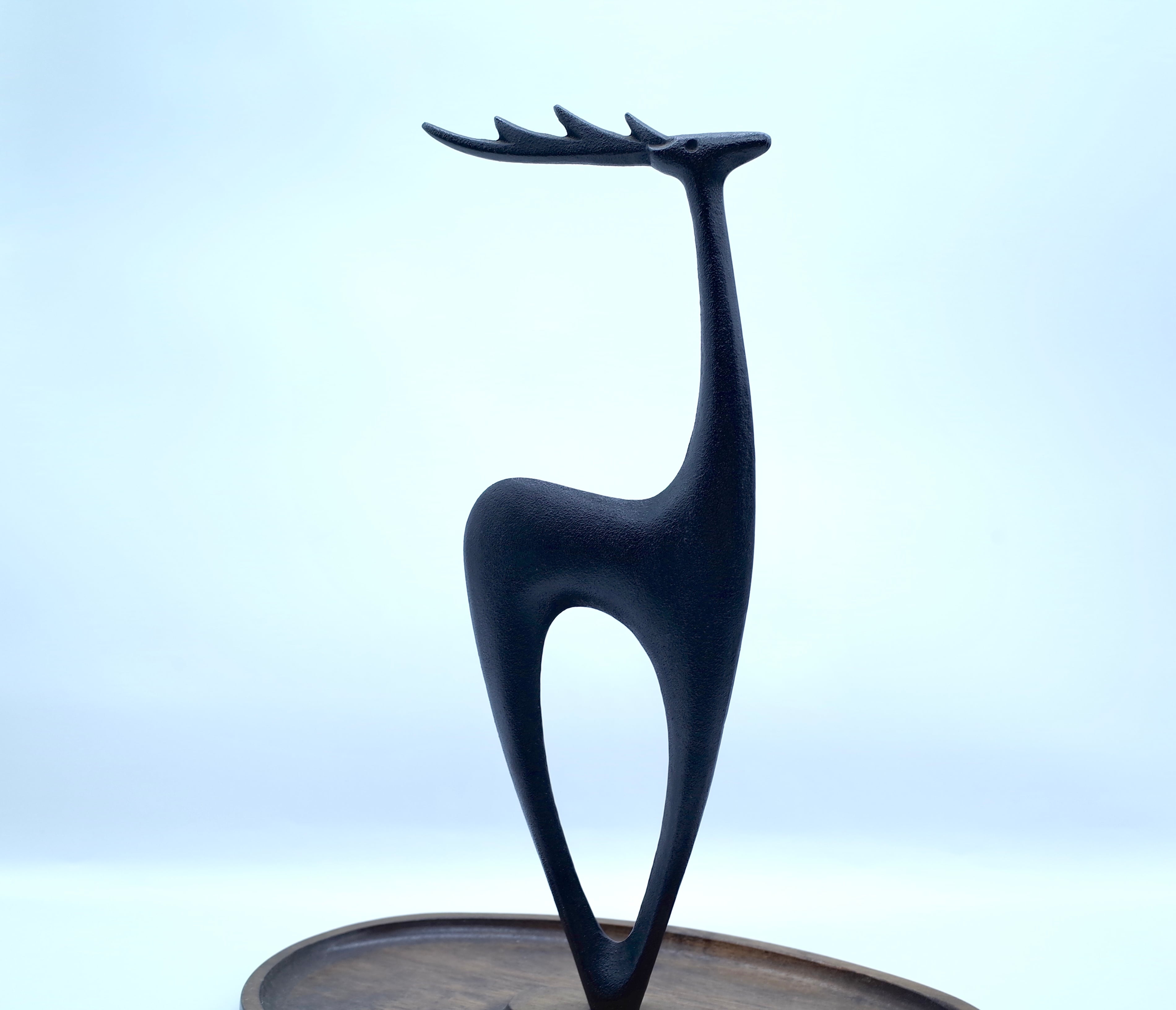 鋳鉄の持つ重みと、細く滑らかなラインが共存した造形が印象的な、南部鉄器の名工・馬場忠寛による鹿のオブジェ。