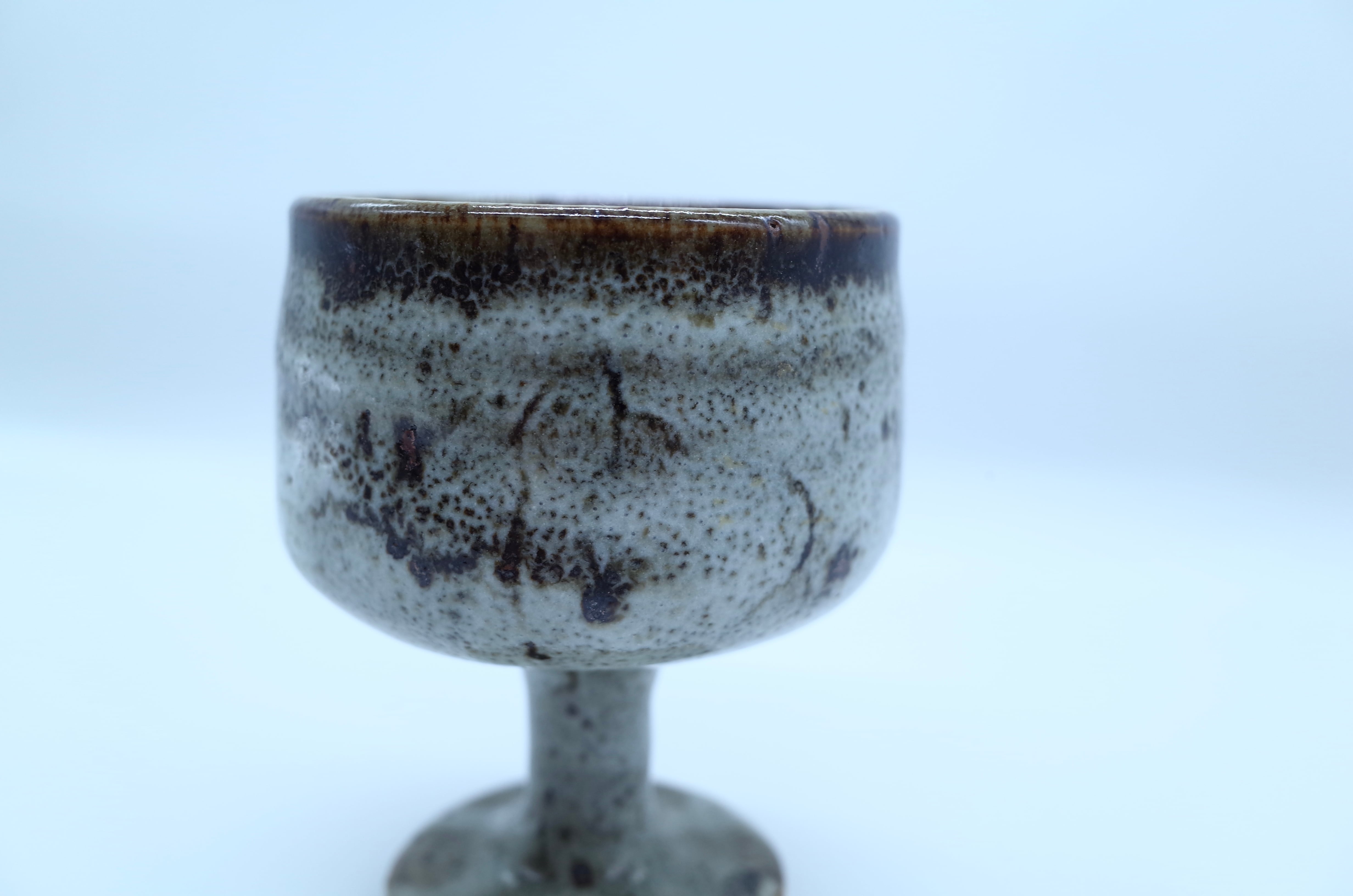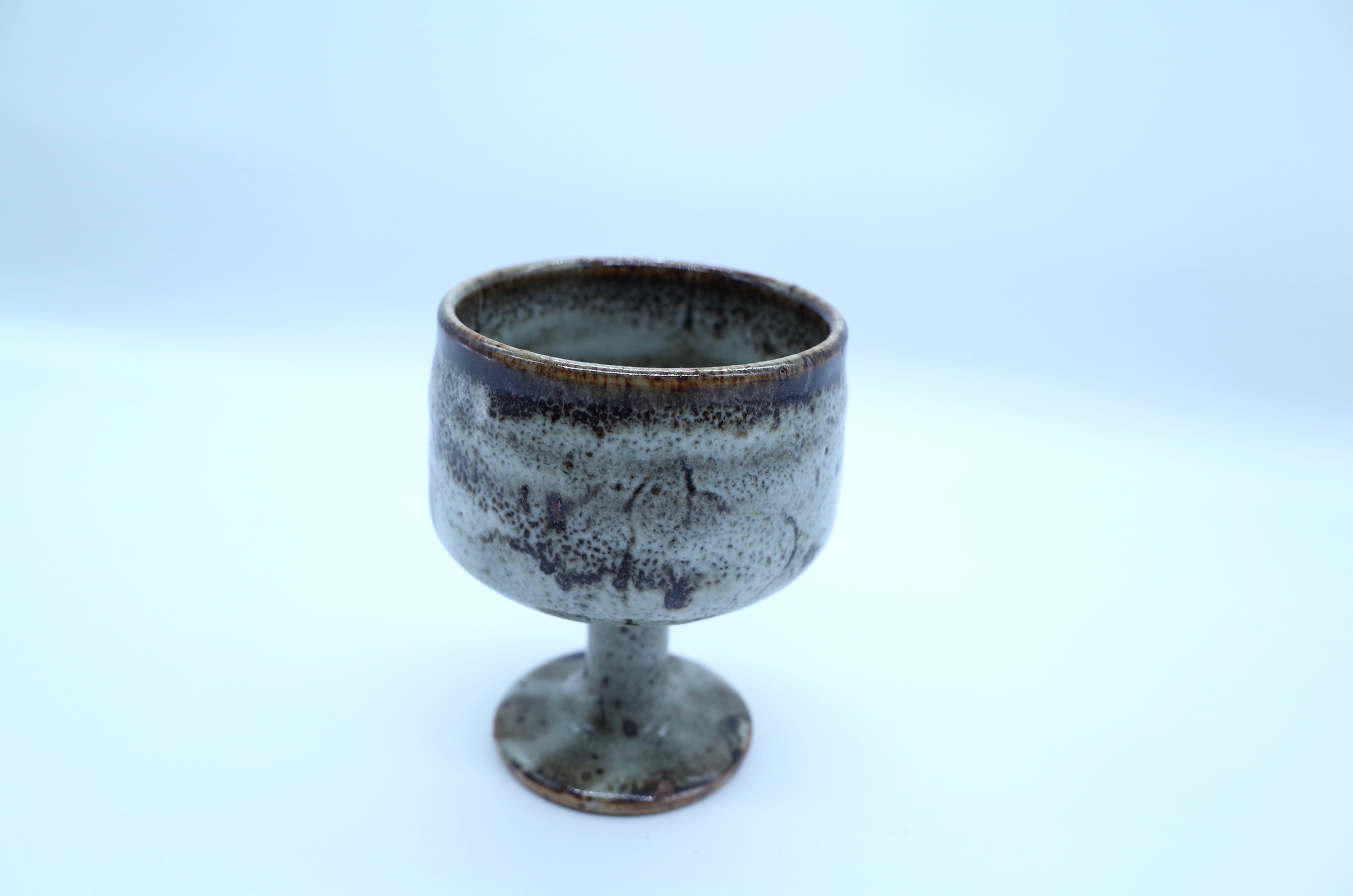1960年代頃に作られた民藝の足付きカップ。灰釉(はいゆう)がとろりと流れたように溜まり、ところどころに“焦げ”が出る、当時の窯業らしい仕上がりです。