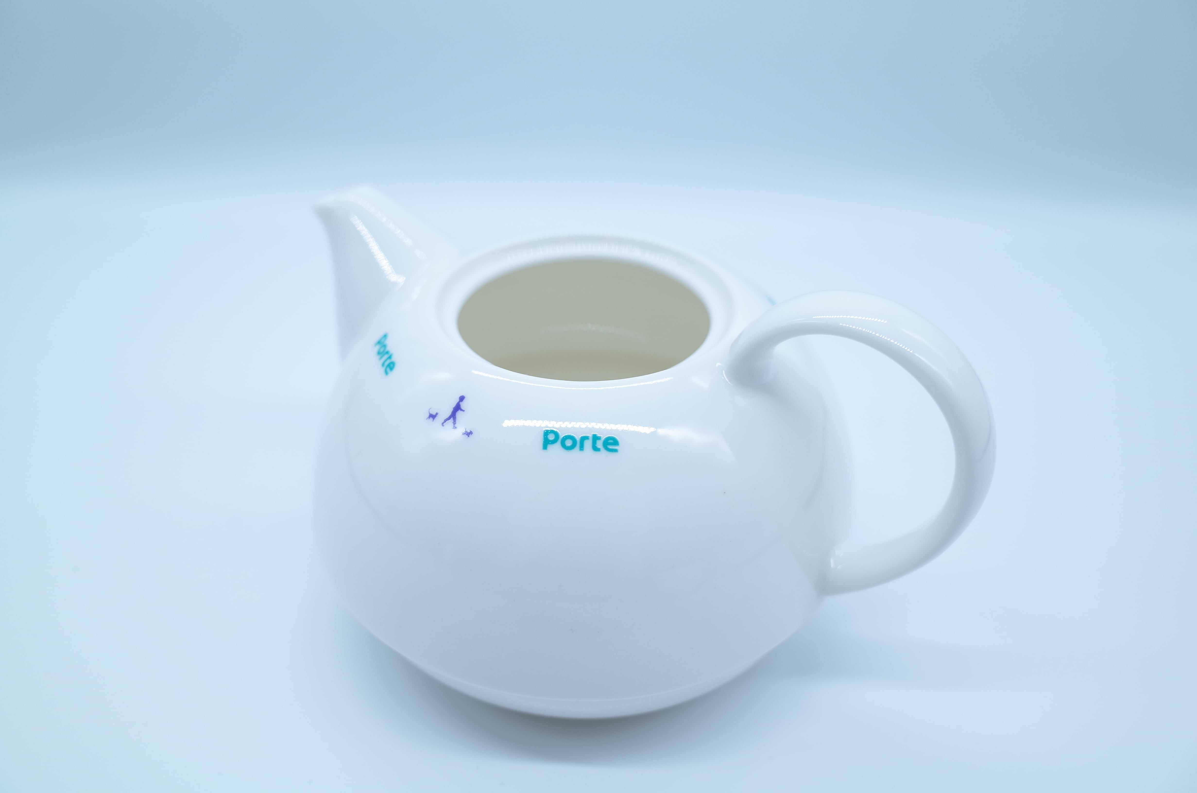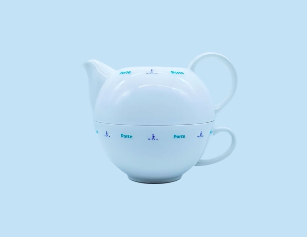 淡いブルーで配されたロゴと小さな人物アイコンの組み合わせがユニークで、どこか北欧陶器のような“柔らかい雰囲気”をまとったデザインです。