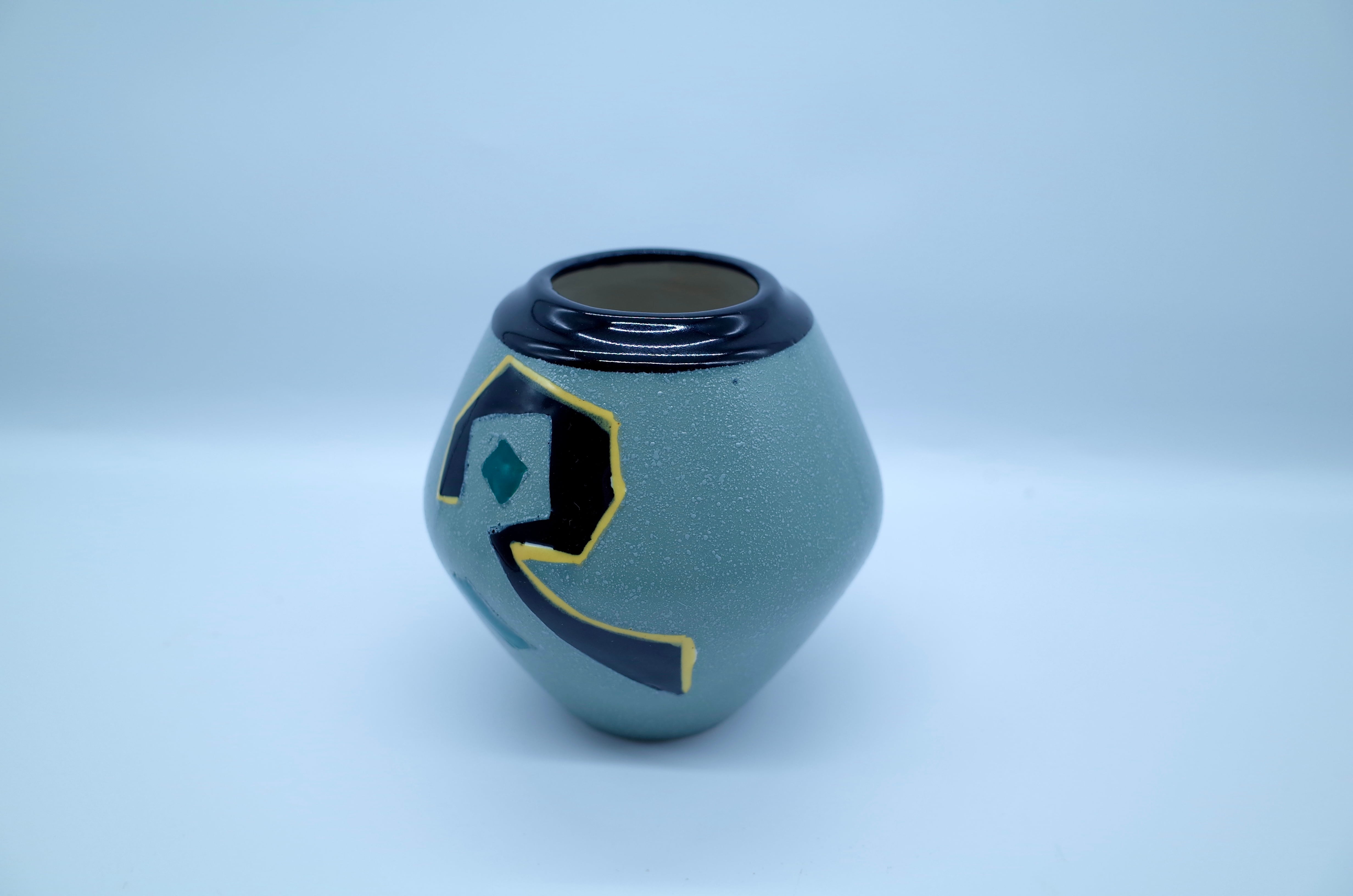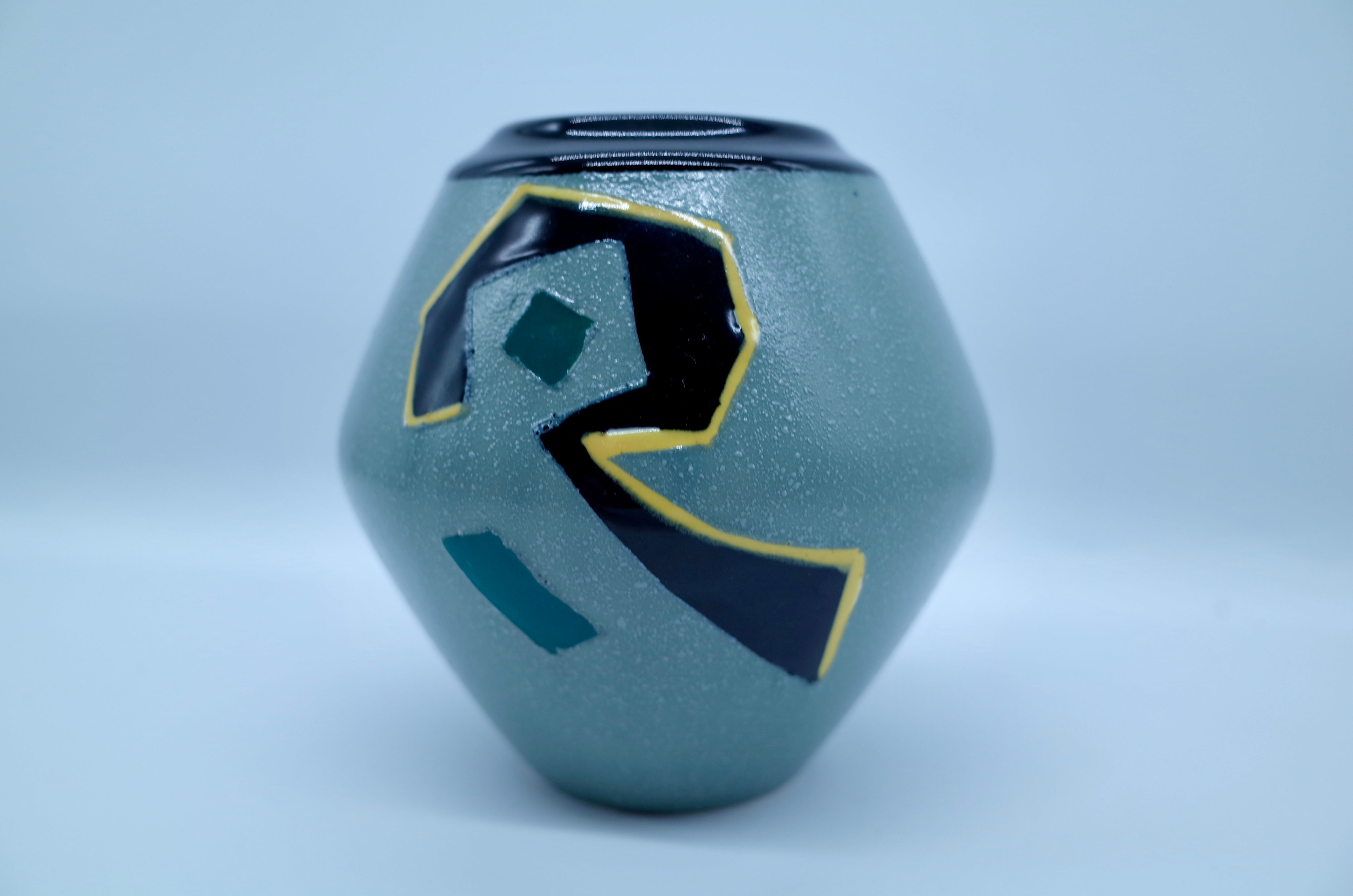 淡いグリーングレーのボディに、ブラックとイエローラインで描かれたクエッションマークの様なモチーフが印象的なヴィンテージ・フラワーベース。