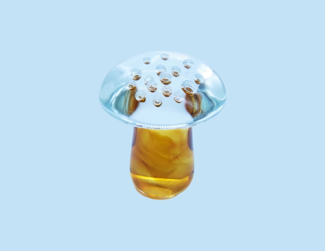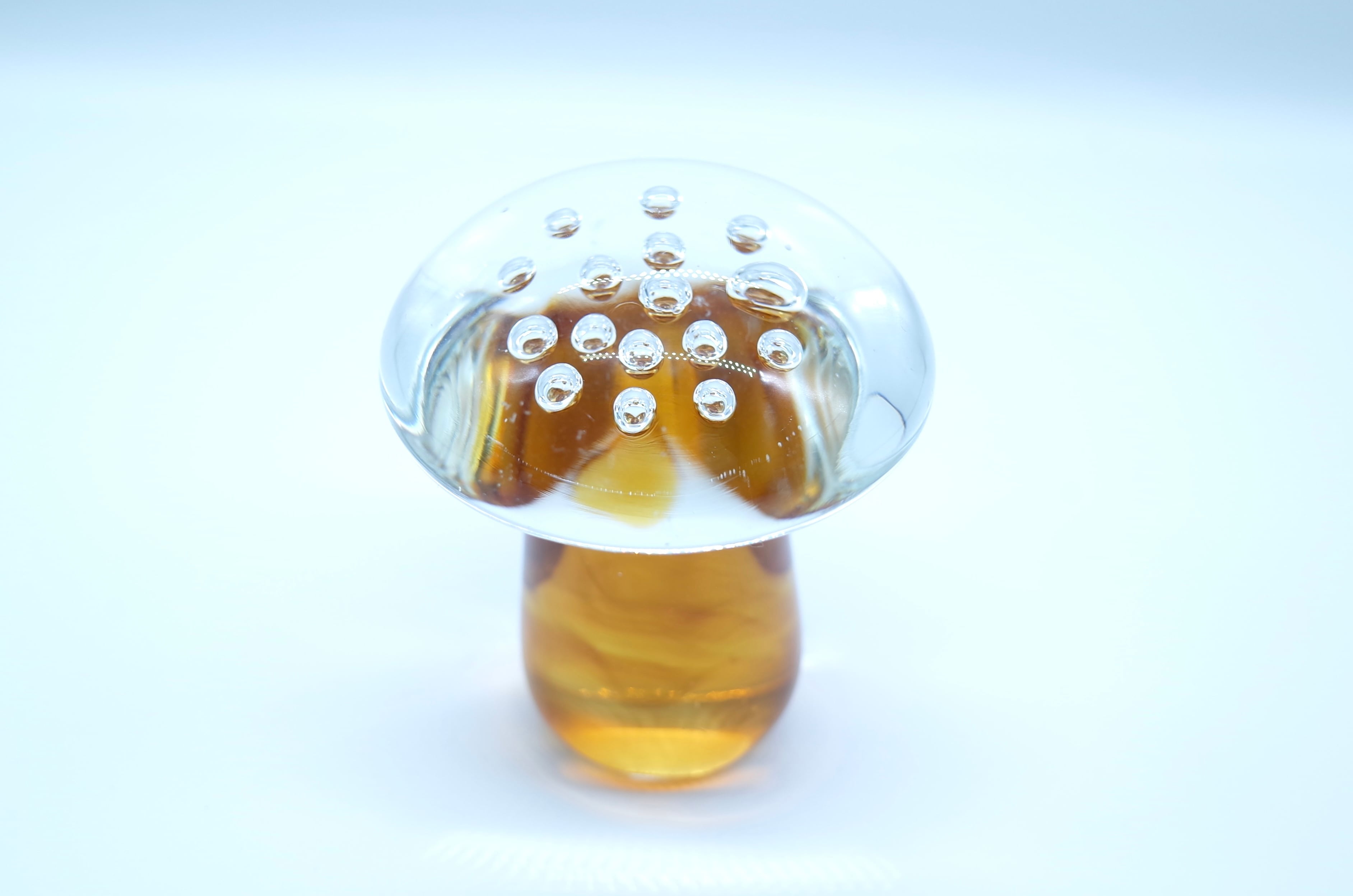 きのこを模した独特のフォルムに、重厚感のあるガラスを組み合わせたオブジェ。