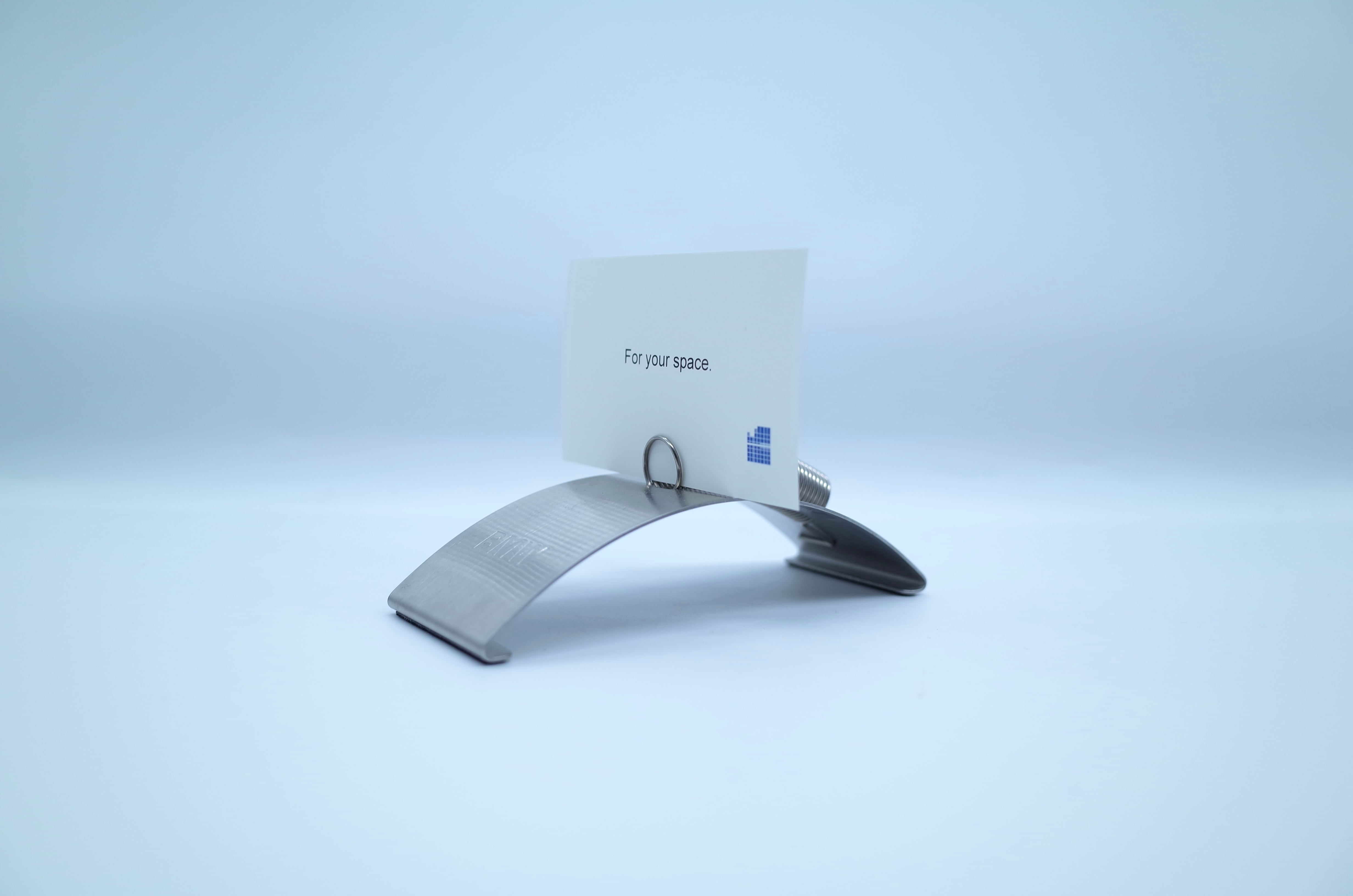 ヘアライン加工されたメタルのベースに、スプリングを取り付けたシンプルな構成で、名刺やメモなどを挟んで使えます。
