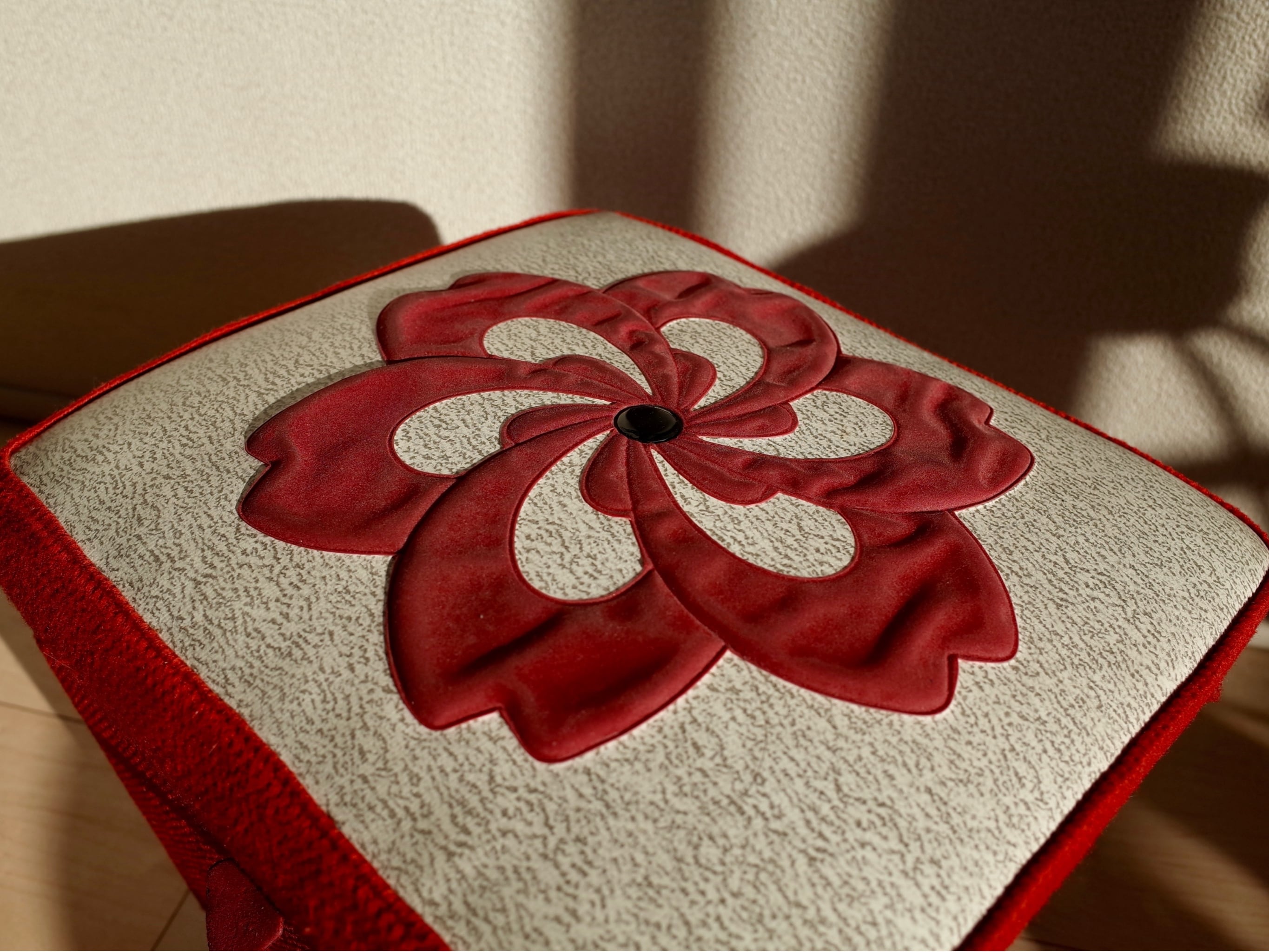 赤と白を基調にしたカラーリングと、花をモチーフにした大判のアップリケが印象的。