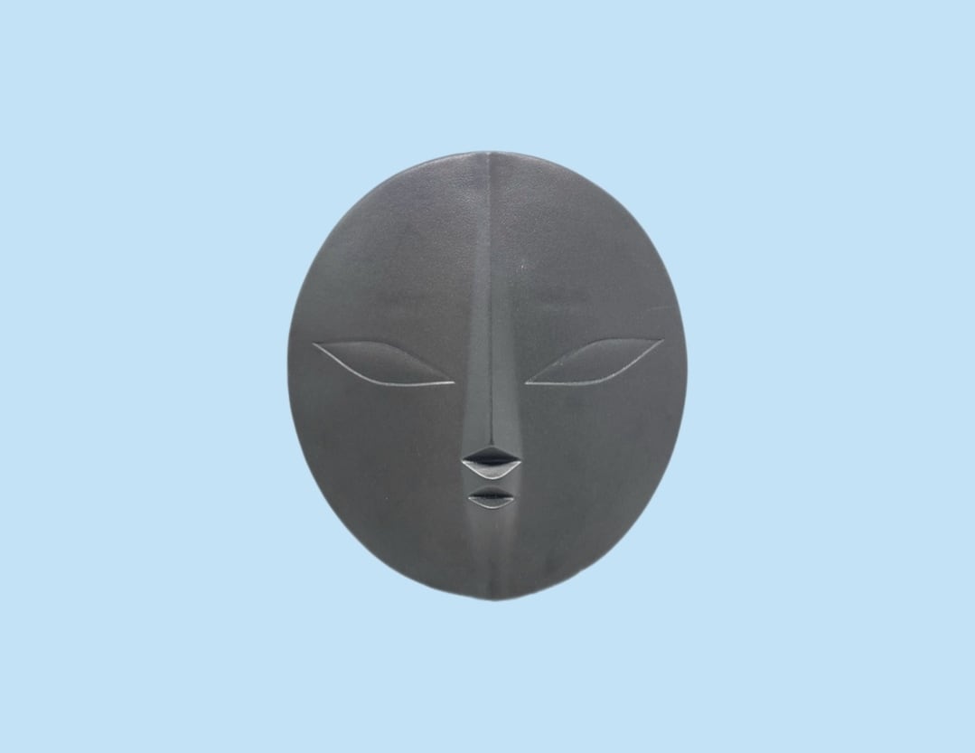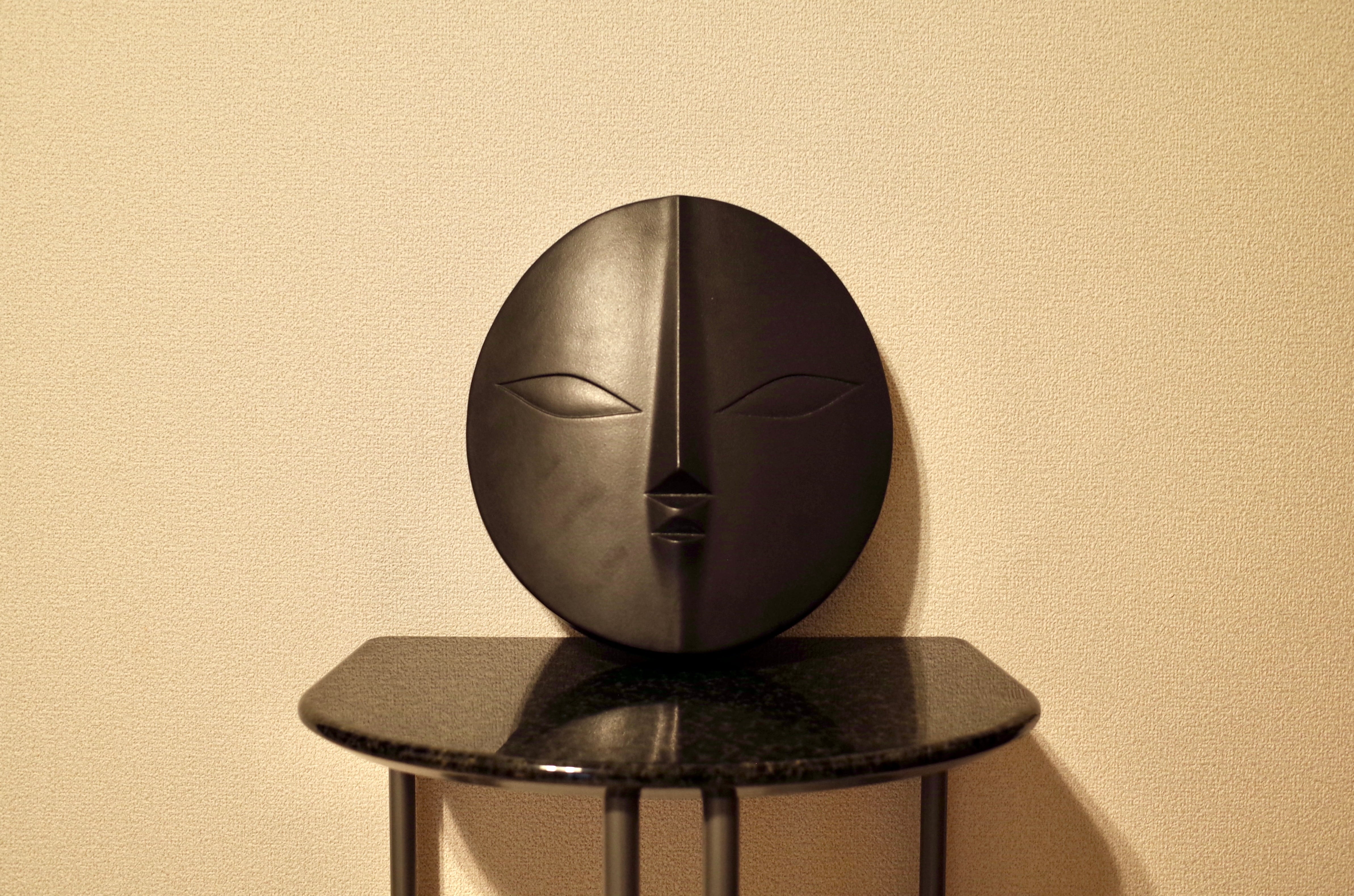 1970年の大阪万博期に制作されたプロダクトで、極端に抽象化された顔の造形とマットブラックの質感が特徴です。目・鼻・口を最小限の線と面で構成しながら、強い造形的緊張感を持つデザイン。