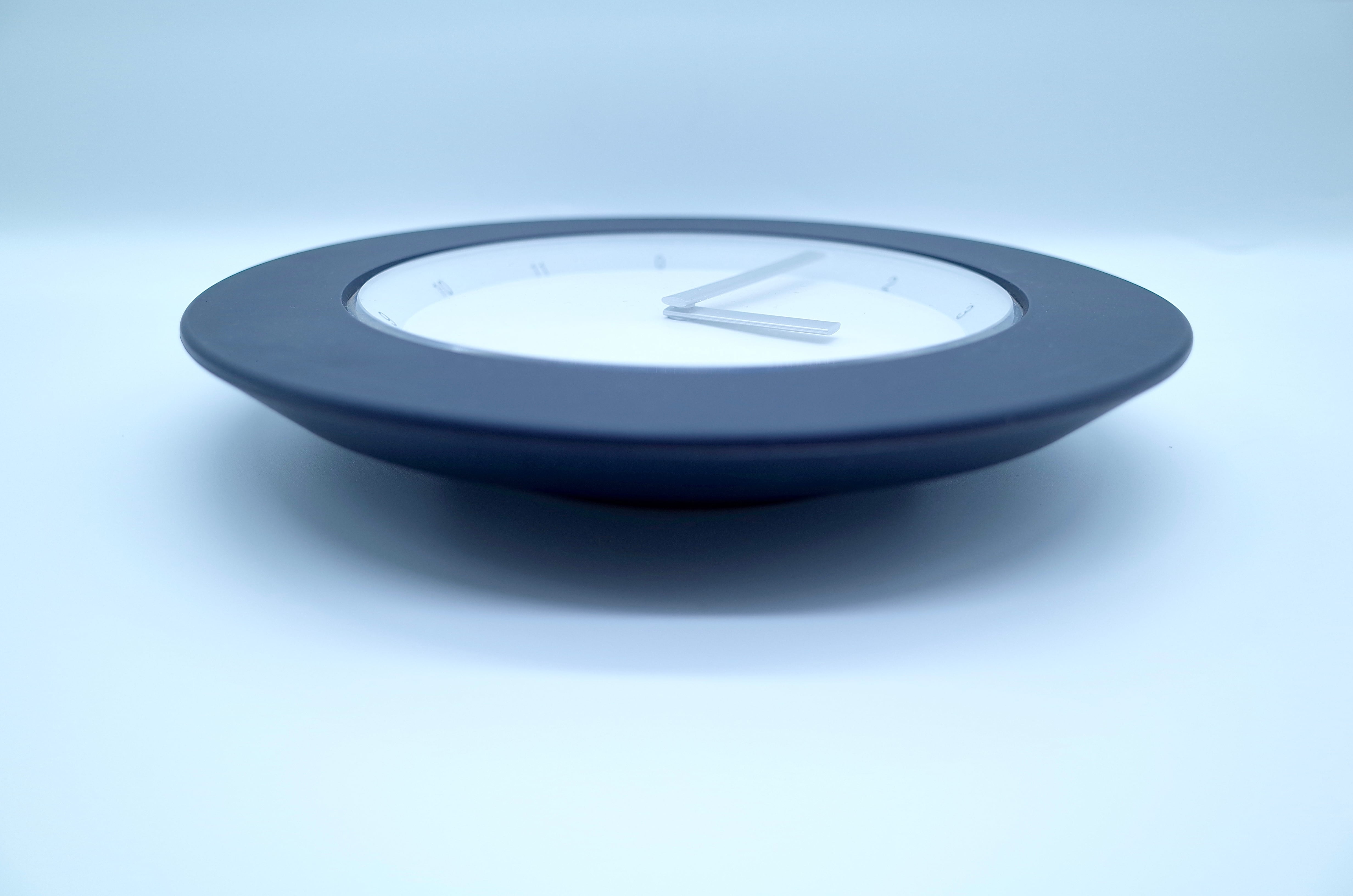 外周のマットブラックフレームと、内側のミニマルな文字盤構成による二重構造が特徴。数字は控えめに配置され、針の造形と余白のバランスで時間を見せる設計です。