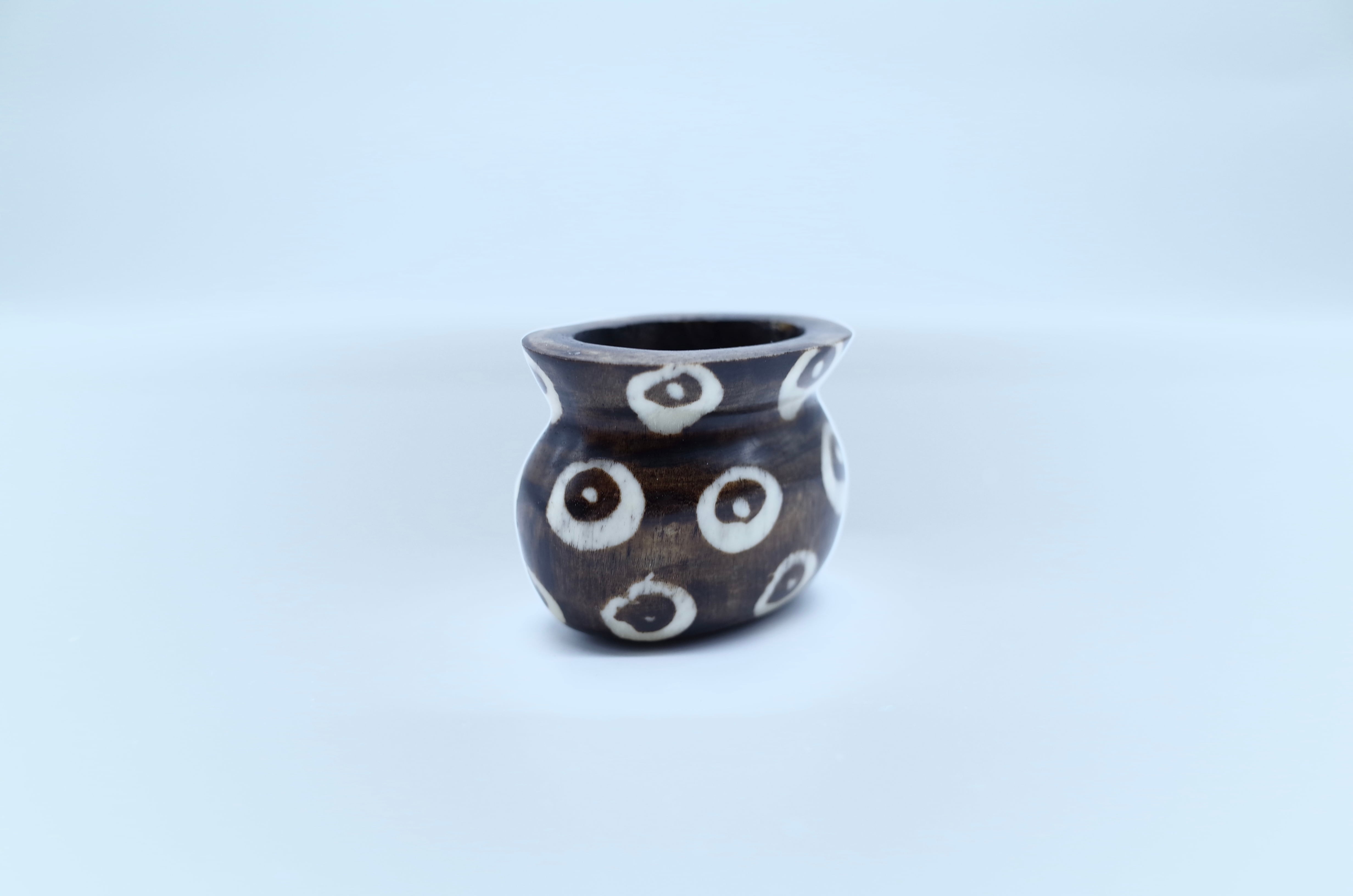 ブラウンを基調にした釉薬の上に、白い円形模様がランダムに配置された装飾が特徴です。