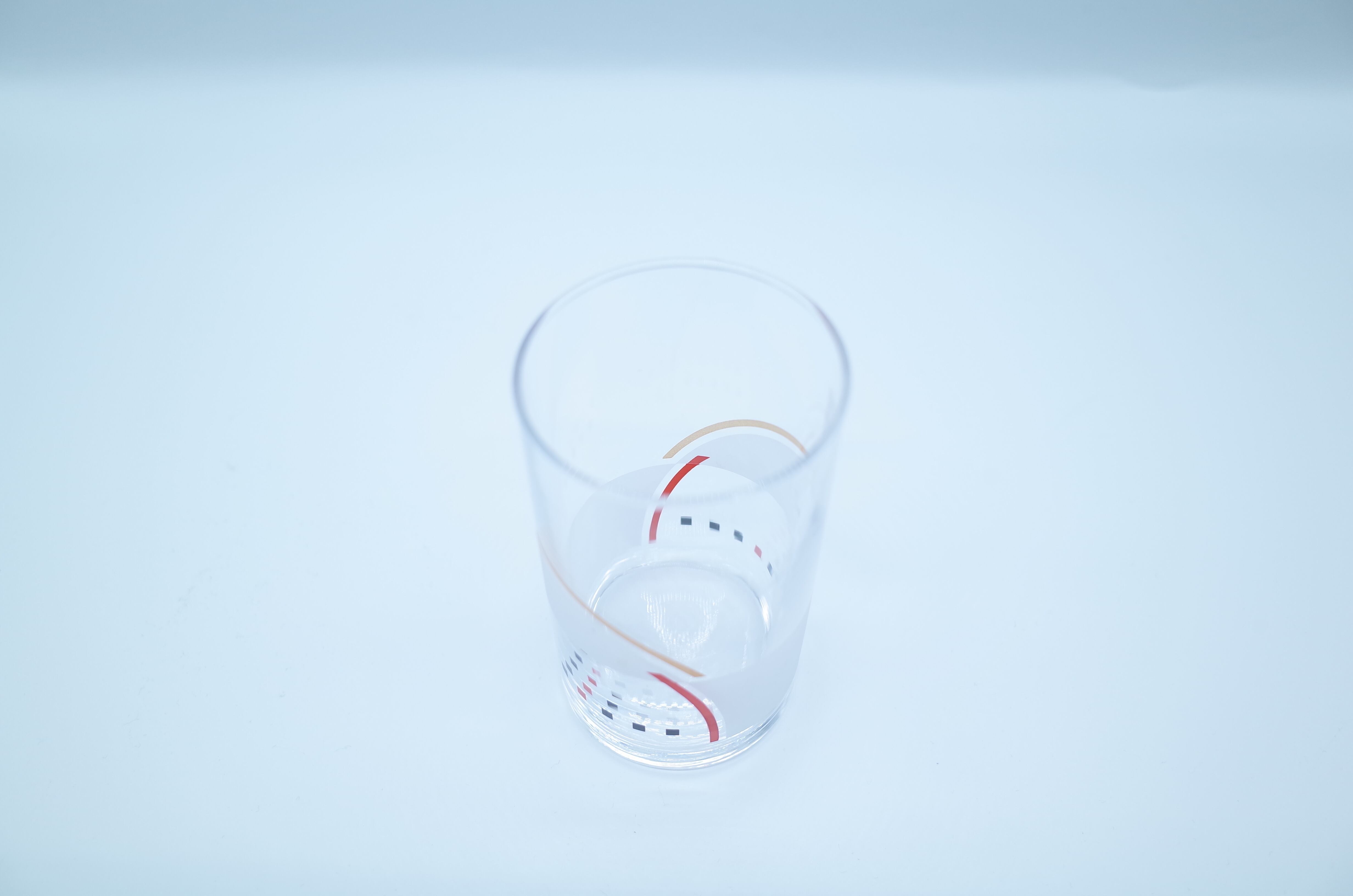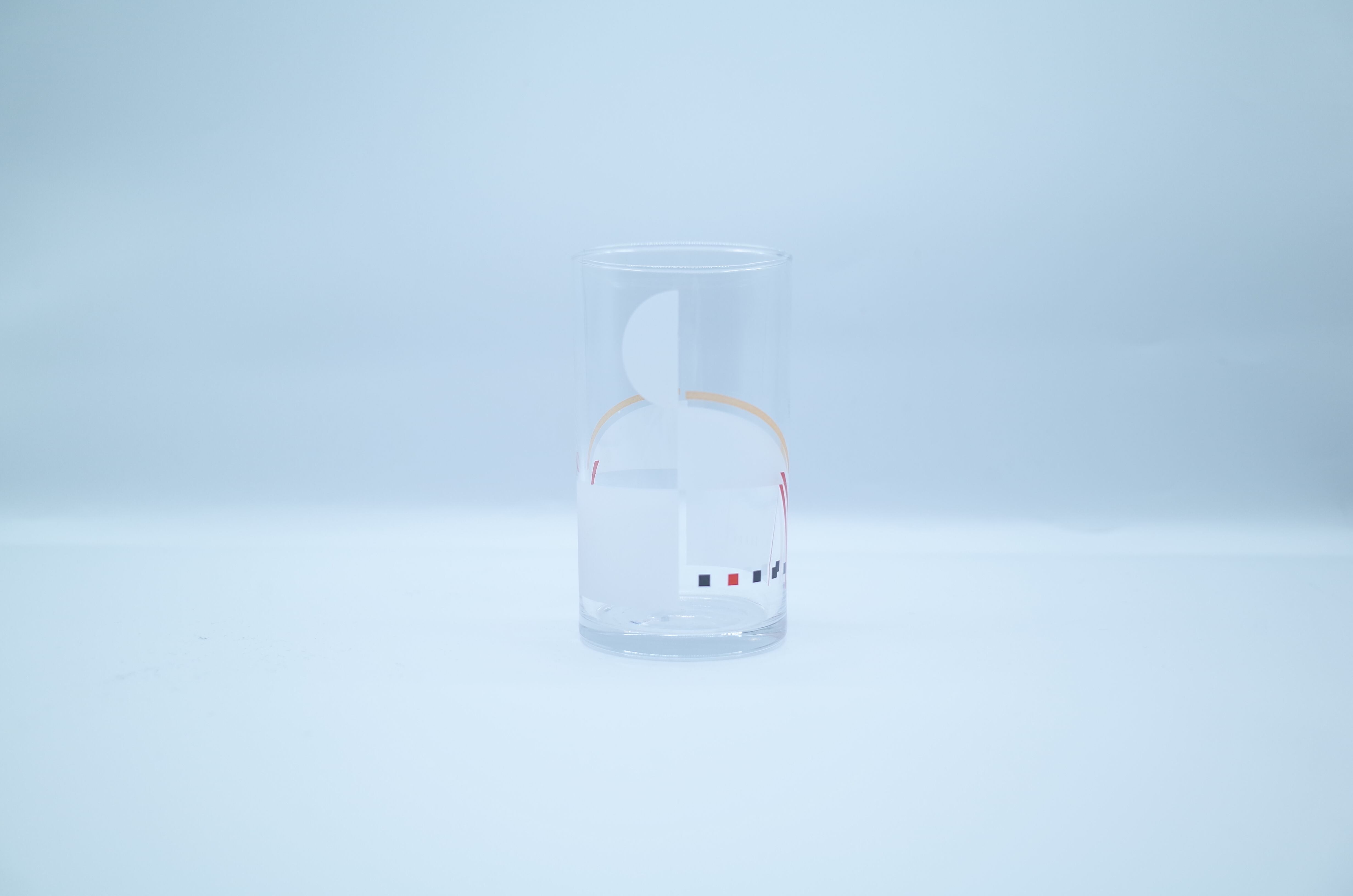 円弧や直線、小さなスクエアを組み合わせた幾何学グラフィックが施されたヴィンテージグラス。