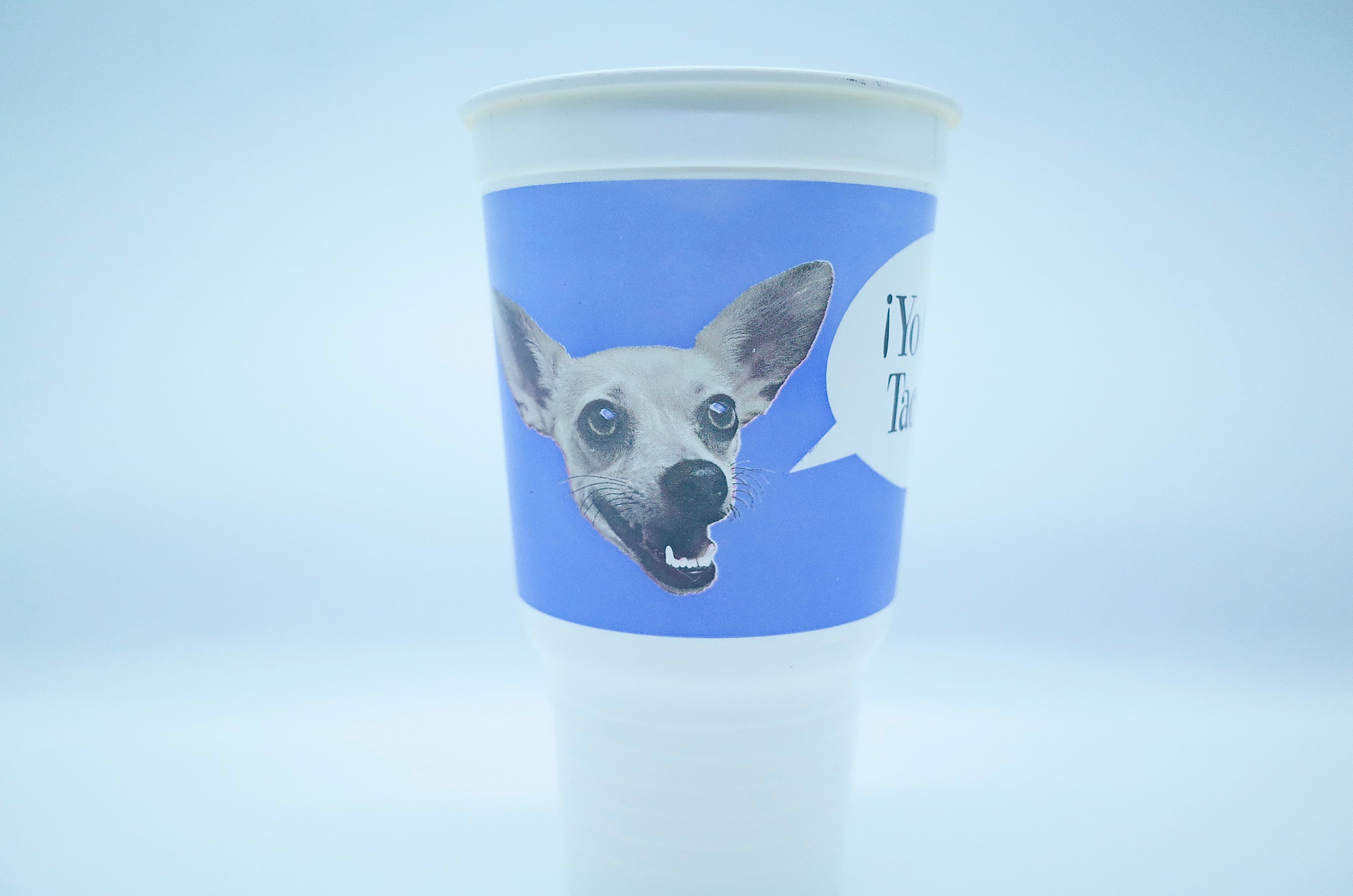 淡いブルーのボディにチワワのグラフィックと「Yo Quiero Taco Bell!」のコピーを配置したデザイン。「Yo Quiero Taco Bell」はスペイン語で「タコベルが欲しい」という意味で、当時の広告キャンペーンで使われていたフレーズです。