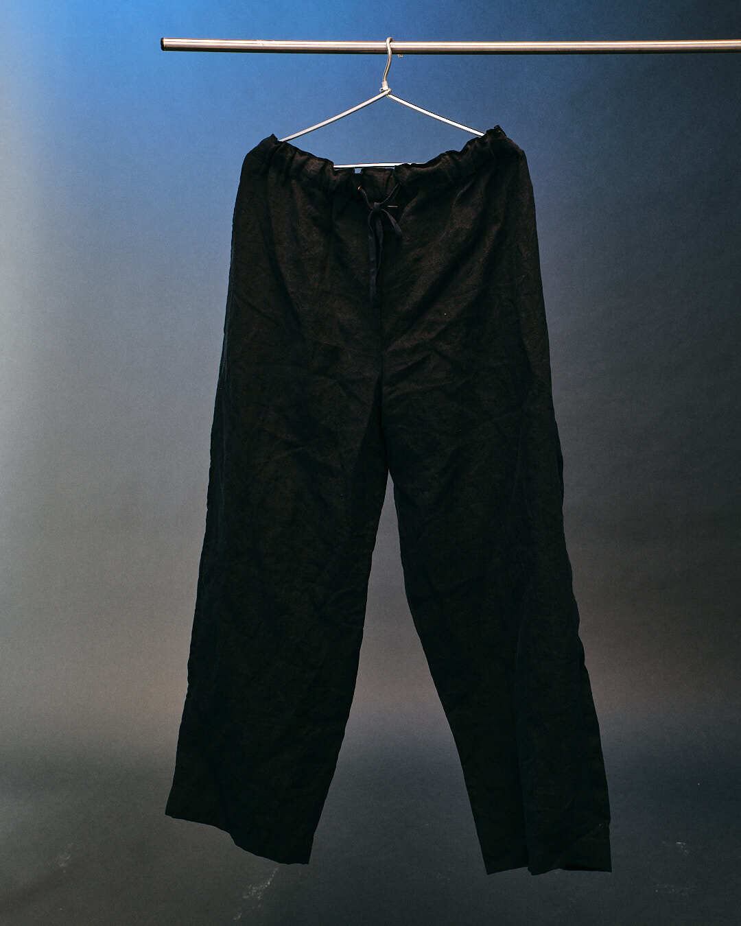 遠州地方で職人が丁寧に織り上げたリネン素材を使い、オールハンドメイドで製作されたワイドシルエットのバギーパンツ。