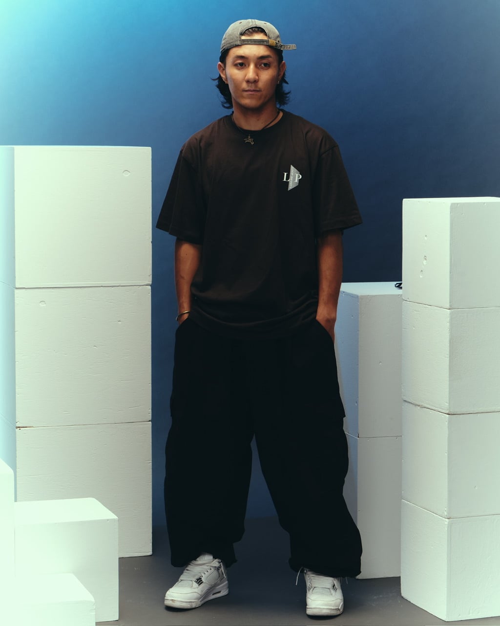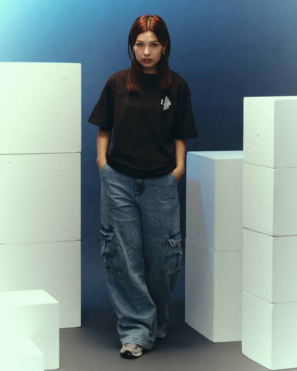 ・ブラックのワイドデニムやカーゴパンツでグラフィックを活かしたコーディネート