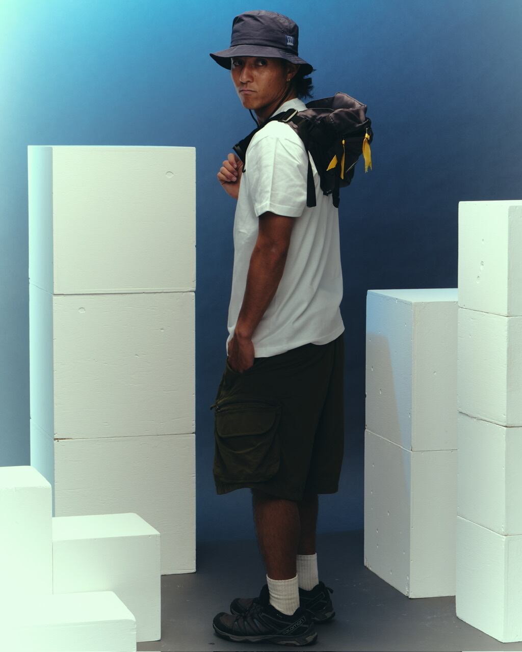 同素材のナイロンパンツやシャツとセットでストリートミックスに