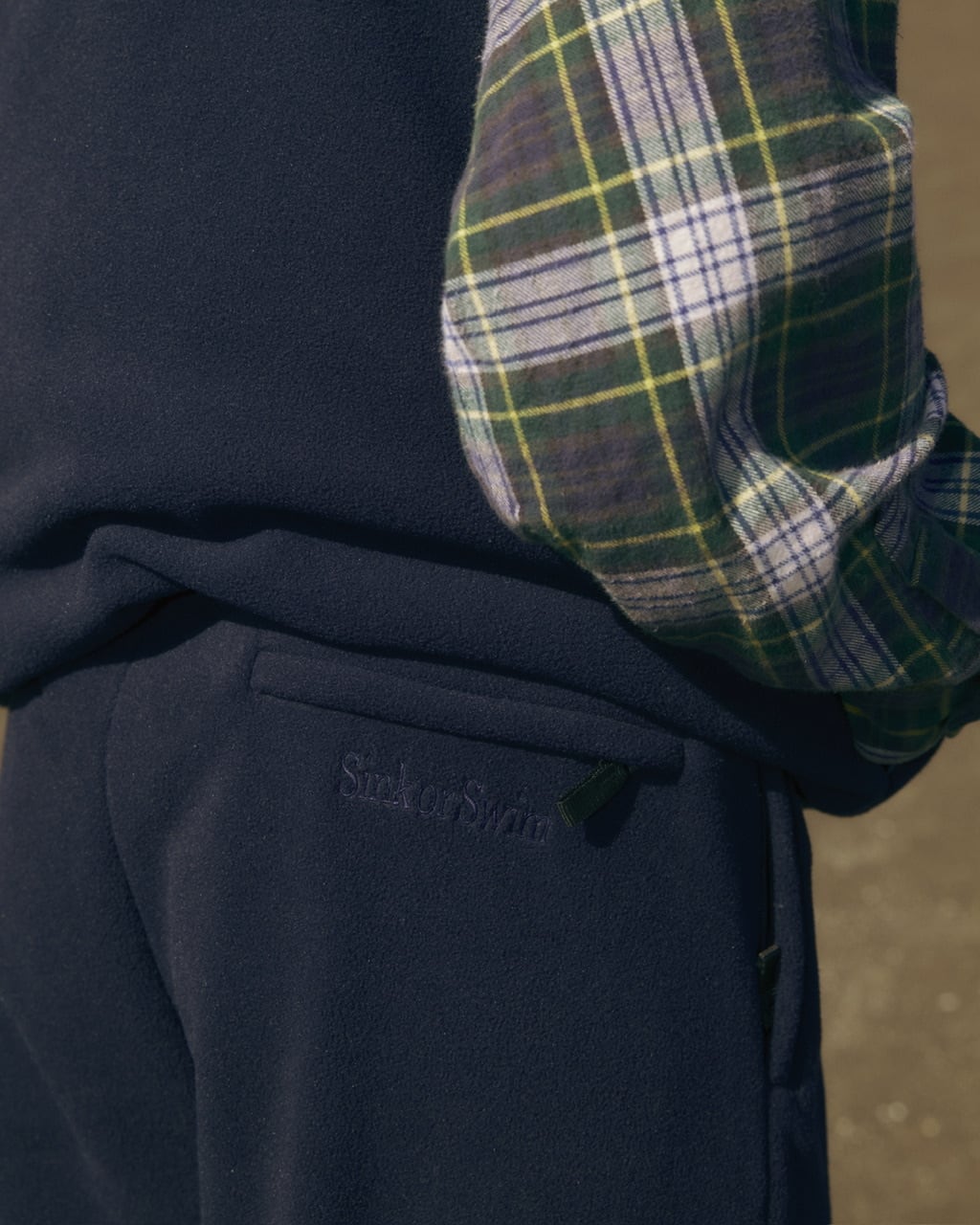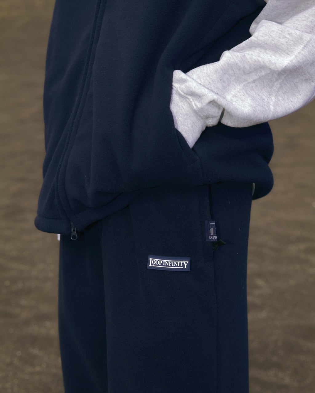 同素材のマイクロフリースベストと合わせたセットアップはもちろん、トーンを合わせたクルーネックやアウターをゆるく重ねて、都会的なリラックス感のあるコーディネートに。