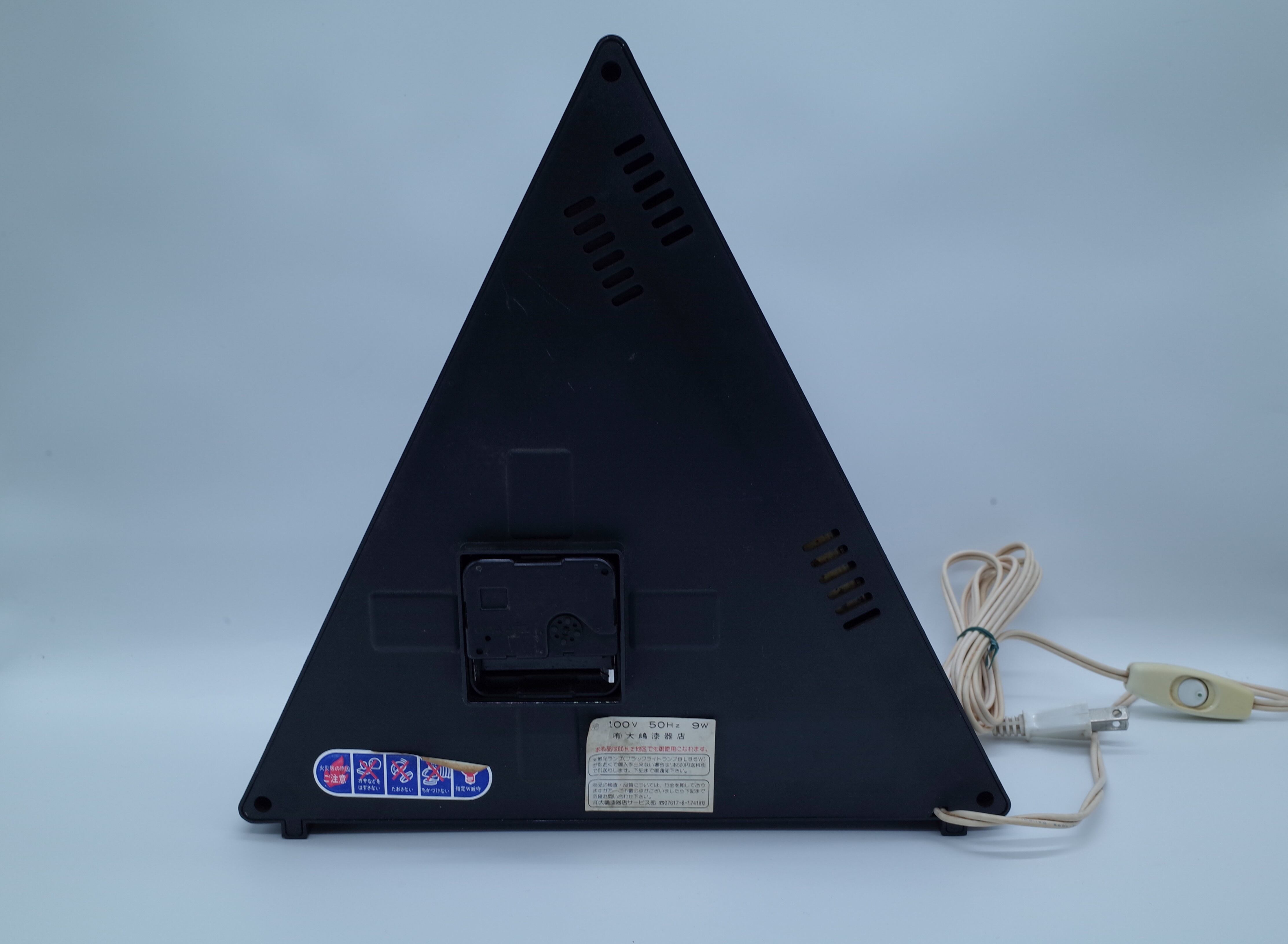 三角型のアクリルボディに、内部ネオン照明を仕込んだ卓上時計。
